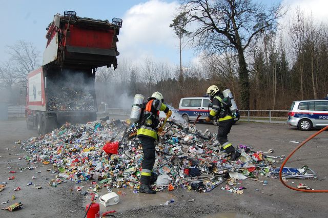 Vor Ort waren erste Löschversuche mittels Feuerlöschern durch die Mannschaft des LKWs und die Polizei ohne Erfolg geblieben. Das Ladegut (Metalldosen und sonstige Metallbehälter) wurde auf einem Parkplatz ausgekippt und das Brandgut unter schwerem Atemschutz abgelöscht. Mittels Wärmebildkamera wurde der Müll auf Glutnester überprüft um eine nochmalige Entzündung auszuschließen. Vermutlich geriet die Ladung auf Grund einer unter Druck stehenden Dose, die sich beim Zusammenpressen entzündete, in Brand.