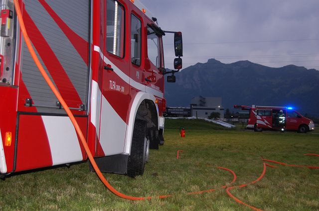 Die Feuerwehr Gisingen war mit drei Fahrzeugen (KDOF, TLF3000/200 und LFB-A) und 37 Mann ca. 30 Minuten im Einsatz.