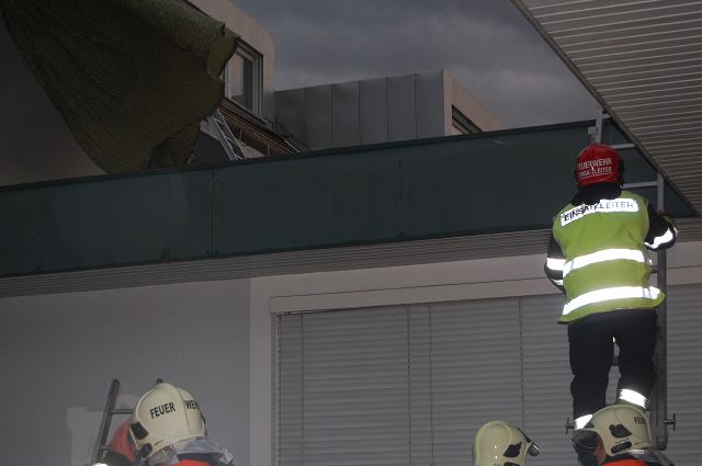 Bei der Ankunft am Einsatzort stand der Balkon im 2. Obergeschoss auf der Westseite in Vollbrand und das Feuer drohte auf die Wohnungen überzugreifen. Die Polizeibeamten waren bereits mit der Evakuierung des Gebäudes beschäftigt und der Einsatzleiter der Feuerwehr Altenstadt gab nach seiner Erkundung die notwendigen Befehle an die bereits eingetroffenen Mannschaften der Feuerwehr Altenstadt und Gisingen und erhöhte das Stichwort auf f4 bzw. lies die Drehleiter Feldkirch-Stadt nachalarmieren.