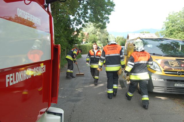 Aufgrund eines technischen Gebrechens verlor ein PKW eine größere Menge an Öl/Treibstoff und verursachte so eine verschmutzte Fahrbahn im Kreuzungsbereich der Rüttenenstraße und Viehgatter. Das ausgelaufene Öl- und Treibstoffgemisch wurde durch die Feuerwehr Gisingen mittels Ölbindemittel aufgenommen und die Straße gesäubert.