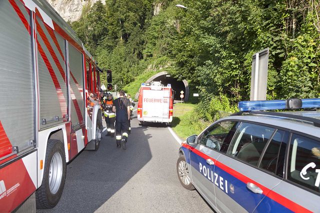 Die Feuerwehr Feldkirch-Stadt war mit 3 Fahrzeugen und 28 Mann im Einsatz. Die Feuerwehr Tosters rückte mit 2 Fahrzeugen und 19 Mann zum Einsatzort aus. Die Feuerhwehr Gisingen war mit 34 Mann und 4 Fahrzeugen am Einsatzort. Ebenso waren zahlreiche Rettungs- und Polizekräfte vor Ort. Auf Grund des Unfalls kam es auf beiden Portalseiten zu erheblichen Verkehrsbehinderungen. Der Motorradfahrer erlitt durch den Unfall Verletzungen unbestimmten Grades. Zwei Personen wurden wegen des Verdachts einer Rauchgasvergiftung behandelt. An den beiden am Unfall beteiligten Fahrzeugen entstand Totalschaden.