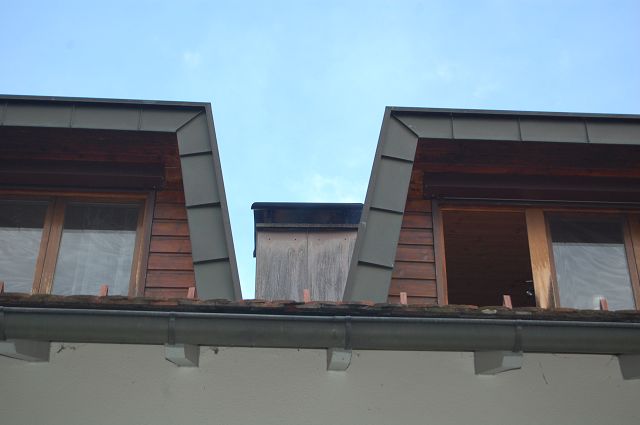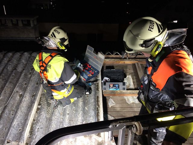 Das Dach musste mittels der Drehleiter der Feuerwehr Feldkirch-Stadt geöffnet werden, um an die letzten Glutnester heran zu kommen.