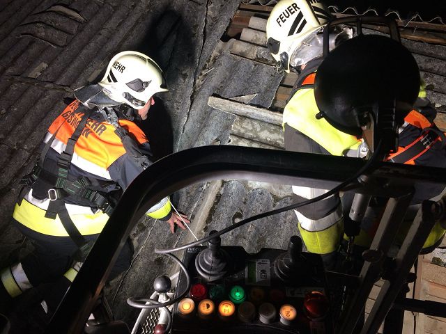 Über die Feuerleitern und mittels weiterer Steckleiterteile gelangten unsere Einsatzkräfte auf das Dach und Vordach, um dort die gelösten Elemente zu fixieren und weitere Schäden zu verhindern. Im Anschluss daran wurden die darunterliegenden Maschinen mit Planen abgedeckt und so vor Wasserschäden geschützt.