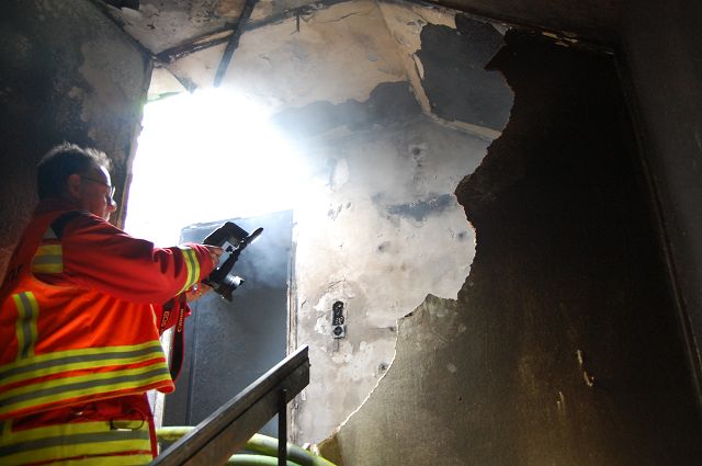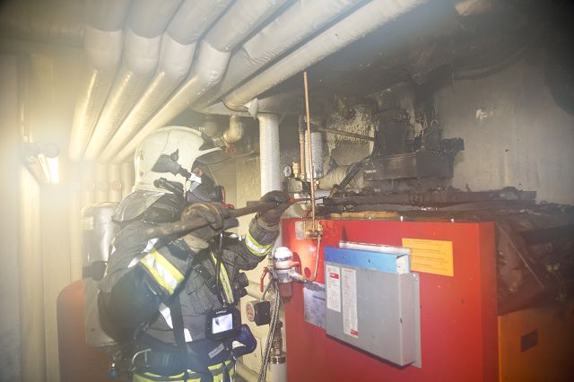 Beim Eintreffen des Einleiters am Einsatzort stellte dieser fest, dass die Evakuierungsmaßnahmen bereits durch die Rettungs- und Polizeikräfte eingeleitet wurden. Aus dem Heizraum im Keller des Gebäudes drang dichter Rauch, ein weiteres Vorgehen ohne Atemschutz war nicht mehr möglich. Unter schwerem Atemschutz konnte der Atemschutztrupp von Gisingen Tank in den Heizraum vordringen und den Brand rasch unter Kontrolle bringen. Alle Bewohner konnten rechtzeitig und unverletzt das Gebäude verlassen. Vermutlich geriet die Heizungsanlage auf Grund eines elektronischen Defekts in Brand. Durch die gezielte Überdruckbelüftung wurde der Brandraum rauchfrei gemacht und verbleibende Glutnester abgelöscht. Nach der Kontrolle mittels Wärmebildkamera konnte gegen 06:20 Uhr "Brand aus" gemeldet werden.