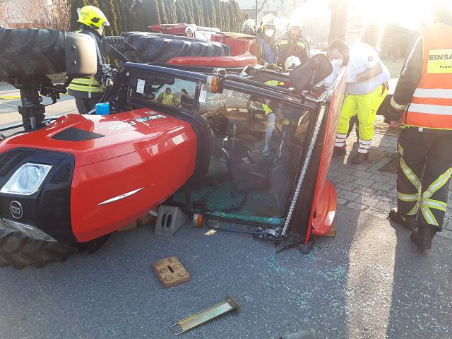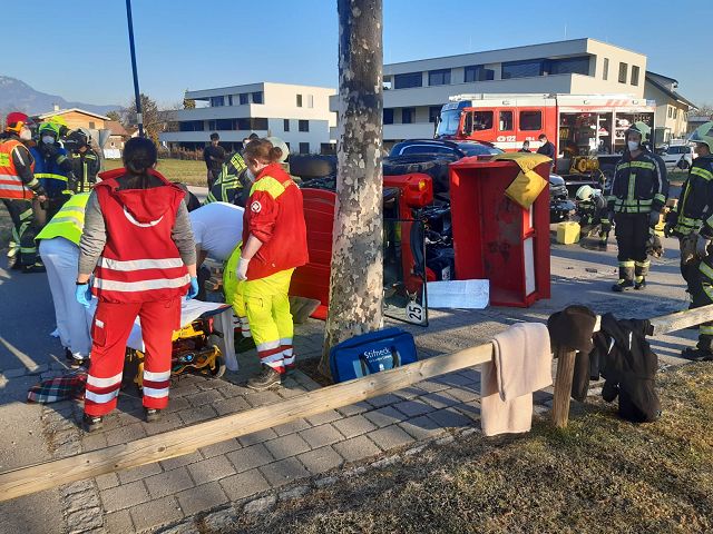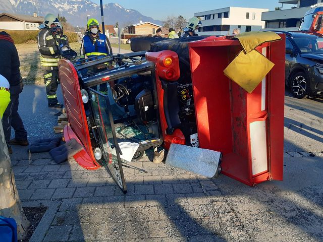 Nach einem Verkehrsunfall auf der Bifangstraße war der Lenker eines beteiligten Traktors in der Fahrerkabine eingeschlossen und musste nach Rücksprache mit dem Notarzt schonend aus dem umgestürzten Trakrot befreit bzw. gerettet werden. Die Person wurde mit Verletzungen unbestimmten Grades an den Rettungsdienst übergeben und in weiterer Folge ins LKH Feldkirch eingeliefert. Der Lenker des zweiten beteiligten Fahrzeugs erlitt einen Schock und wurde ebenso vom Rettungsdienst versorgt.