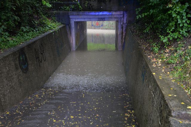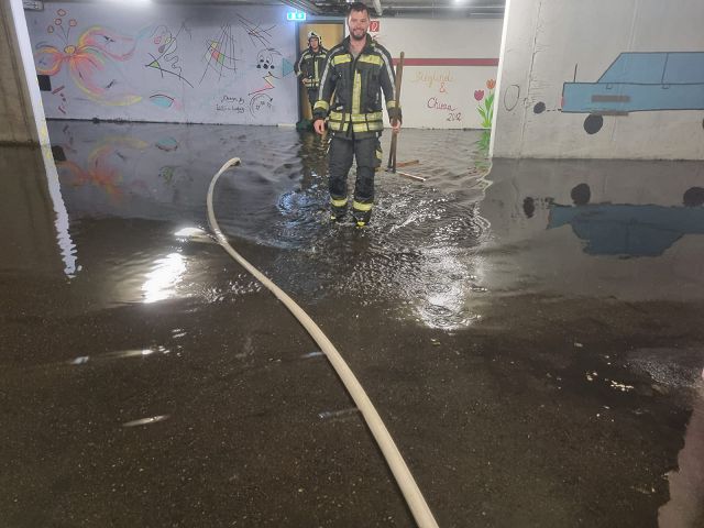 Das in die Tiefgarage eingetretene Wasser konnte vom Kanal- und Abwassersystem nicht mehr aufgenommen werden. Die Wassermassen drohten weitere Teile des Gebäudes zu überfluten, weshalb Tauchpumpen eingestzt werden musste, um das Wasser abzupumpen und weitere Schäden zu verhindern.