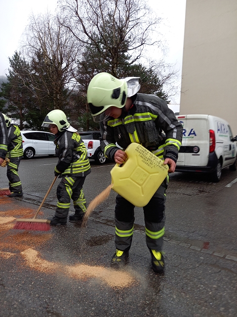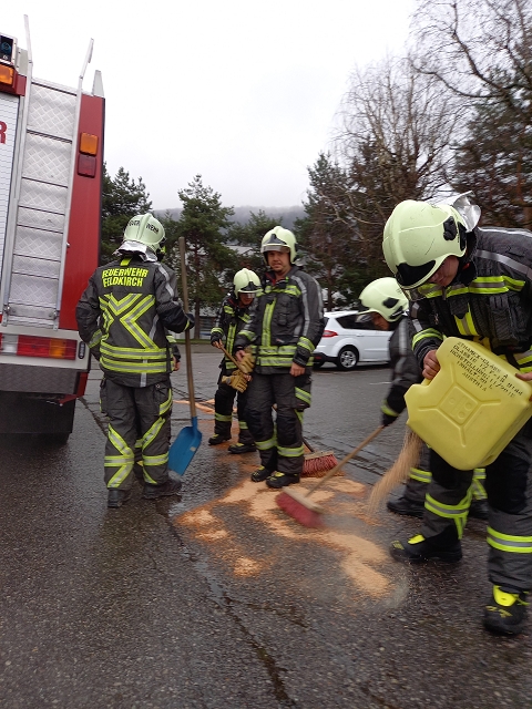 Ein Möbeltransporter verursachte eine Dieselspur, welche sich über Teile der Straßenzüge Fabrikweg, Kapfstraße und Hämmerlestraße zog. Das ausgelaufene Betriebsmittel wurde mit Bindemittel gebunden und im Anschluss die Reinigung der Fahrbahn durch die Stadt Feldkirch (Kehrmaschine) durchgeführt. Vorsorglich wurde außerdem die Aufstellung von Warntafeln veranlasst und die Einsatzstelle schließlich an die Stadtpolizei übergeben.