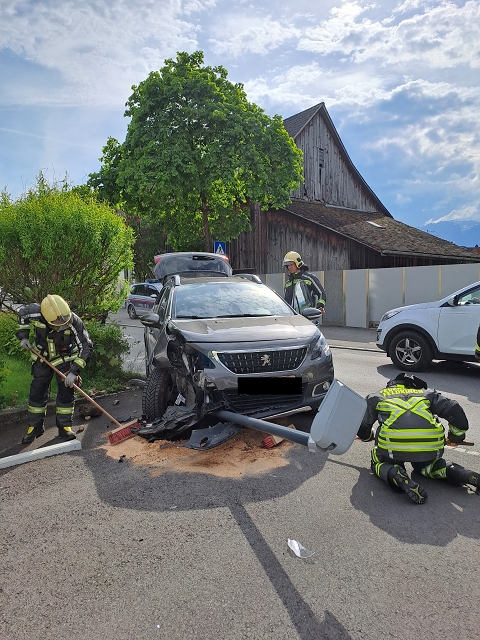 t2, Feldkirch-Gisingen, Kapfstraße > Verkehrsunfall, PKW gegen Laterne, Betriebsstoffe ausgetreten