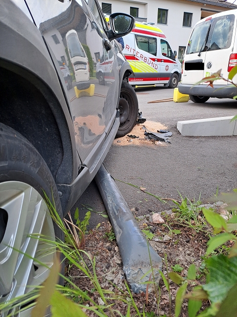 Am 17.04.2023, 10:56 Uhr, erfolgte die Alarmierung der Rettungs- und Feuerwehrleitstelle: t2, Feldkirch-Gisingen, Beim Gräble, ÖRK Krankentransportzentrale > Verkehrsunfall mit Verletzung, PKW gegen Hausmauer.
