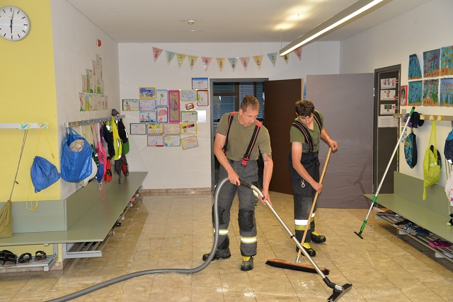 Im 2. OG des großflächigen Schulgebäudes trat Wasser aus einem überlaufenden Waschbecken aus. Das Wasser drang in weiterer Folge vom 2. OG über Gang- und Deckenbereiche bis in die Kellerräumlichkeiten vor. Außerdem sammelte sich das Wasser im Liftschacht der Schule. Es wurden Tauchpumpen, Nasssauger und Wasserschieber eingesetzt, um die beträchtliche Wassermenge bestmöglich aus dem Gebäude zu entfernen. Weiter aus den Decken tropfendes Wasser wurde mittels Auffangbehältern gesammelt, um noch größere Schäden zu vermeiden. Die Einsatzstelle konnte schließlich an den Hauswart und den Gebäudeverwalter übergeben werden.
