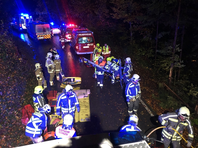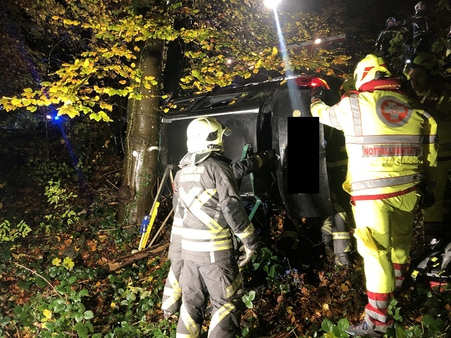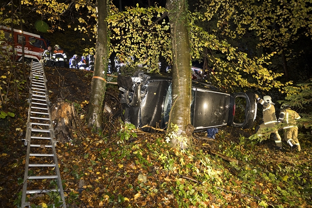 Ein junger PKW-Lenker geriet aus unbekannter Ursache bei der Abfahrt von der Nofler Egg in einer Rechtskurve über den linken Fahrbahnrand hinaus und stürzte ca. 10 Meter im steilen, bewaldeten Gelände ab. Das Fahrzeug mit 3 weiteren Mitfahrern kam auf der Fahrerseite, seitlich an einen Baum gelehnt, zum Stillstand. Zwei der Mitfahrer konnten sich selbstständig aus dem schwer beschädigten Fahrzeug befreien und die Rettungskräfte verständigen. Gemäß dem hinterlegten Alarmplan wurde die Feuerwehr Gisingen als Stützpunkt für hydraulisches Rettungsgerät zeitgleich mit der einsatzleitenden Feuerwehr Nofels alarmiert.