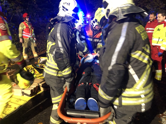 Die Einsatzkräfte mussten sich teilweise über Leitern Zugang zum Unfallfahrzeug schaffen, das in steilem Gelände zum Liegen kam. Der Fahrer konnte durch die Stadtpolizei unverletzt aus dem Fahrzeug gerettet werden, die Beifahrerin war eingeklemmt und konnte sich nicht selbstständig befreien. Unsere Hauptaufgabe bestand in der Sicherung des Unfallfahrzeugs und der schonenden Rettung der Beifahrerin. Über den Kofferraum gelangten wir in das Fahrzeug und konnten die Innenbauteile soweit entfernen, dass die seitlich im Gurt hängende Patientin rasch mittels Spineboard aus dem Fahrzeug gerettet werden konnte. Alle Insassen wurden mit der Rettung in das LKH Feldkirch transportiert. Über den Grad und das Ausmaß der Verletzungen ist nichts bekannt. Am Fahrzeug entstand Totalschaden und es konnte nur mehr mit einem Kran geborgen werden.