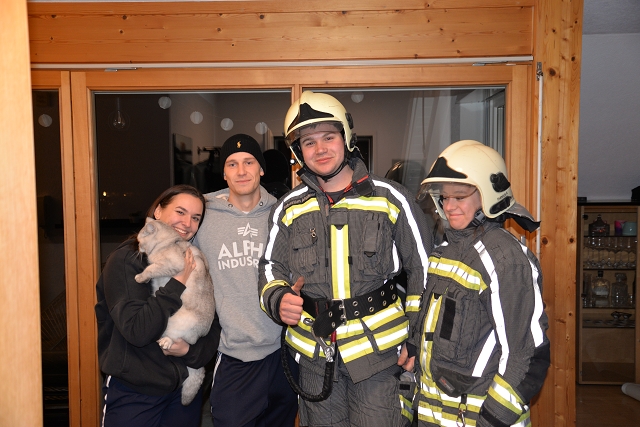 Mittels Steckleiterteilen konnten wir über den Balkon auf das Dach gelangen, die Katze unter entsprechender Eigensicherung schließlich fassen und unverletzt an die glücklichen Besitzer übergeben.