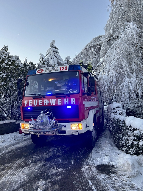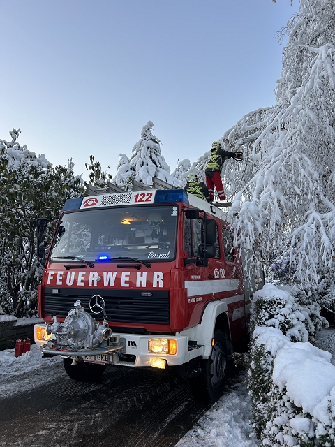 Das Dach des LFB wurde zur Arbeitsplattform, so konnten die Äste mit vereinten Kräften vom Schnee befreit und abgeschnitten werden. Die Straße war im Anschluss wieder frei befahr- und begehbar.