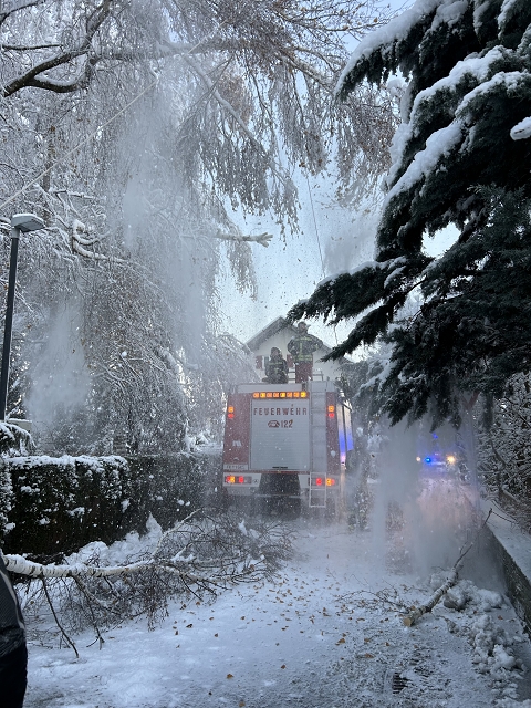 Einsatz im Winterwunderland für die Feuerwehr Gisingen am 03.12.2023 um 07:39. Auf Grund der Schneelast wurden Äste einer großen Birke auf die Straße gedrückt und brachen teilweise ab.