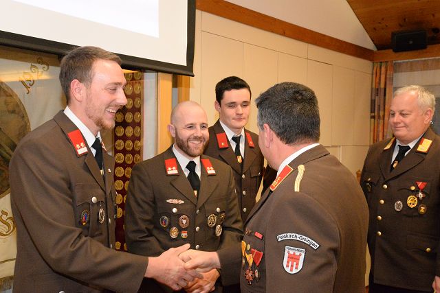 Ebenso standen dieses Jahr auch wieder Beförderungen auf der Tagesordnung. So wurden mit LM Benjamin Gau und LM Julian Schachenhofer zwei Gruppenkommandanten zum Zugskommandanten (Brandmeister) und mit FM Thomas Lampert und FM Manuel Feurstein zwei engagierte Feuerwehrmänner zum Gruppenkommandaten-Stv. (Löschmeister) befördert. Diese vier Dienstgrade sollen zukünftig das Kommando der Feuerwehr Gisingen verstärken und bei Einsätzen und Übungen Führungsaufgaben übernehmen.