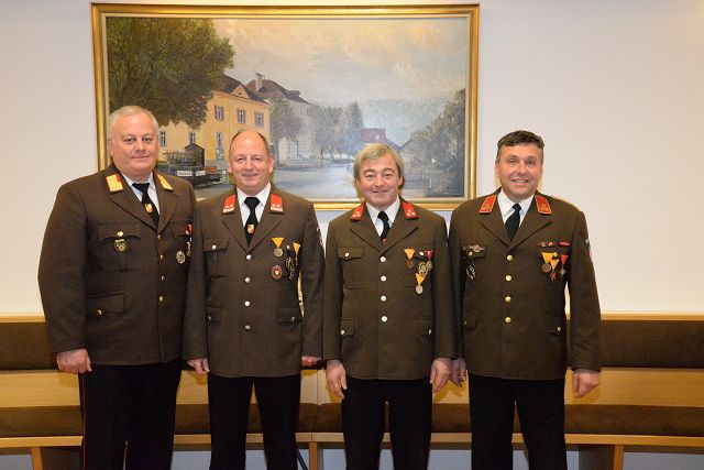 v.l.n.r. - Kdt-Stv. und AFK Josef Fröhlich, Kdt. Gerhard Tschann, Walter Allgäuer, Oliver Hammerle und Bgm. Wolfgang Matt