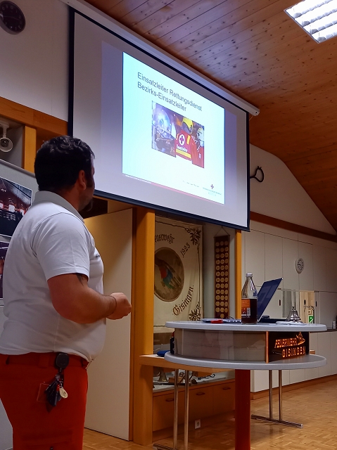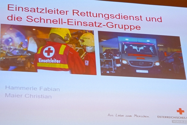 Mit dem Ziel, bei künftigen Einsätzen noch besser zusammenzuarbeiten und sich bei den unterschiedlichsten Einsatzszenarios noch besser ergänzen zu können, erklärten uns die Vertreter der Rotkreuz-Abteilung Feldkirch die einsatztaktischen Überlegungen und Aufgaben des Einsatzleiters Rettungsdienst. Zudem versuchten die beiden hauptberuflichen Rettungssanitäter den über 60 Schulungsteilnehmern den Einsatzablauf sowie die Organisation der Schnell-Einsatz-Gruppe Feldkirch, kurz SEG, zu veranschaulichen.