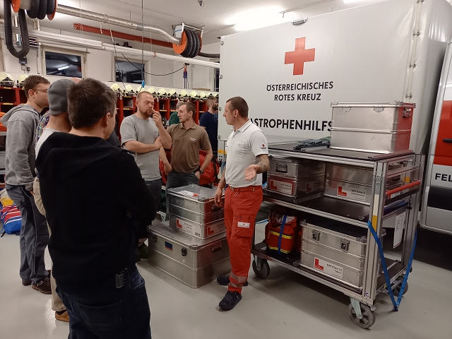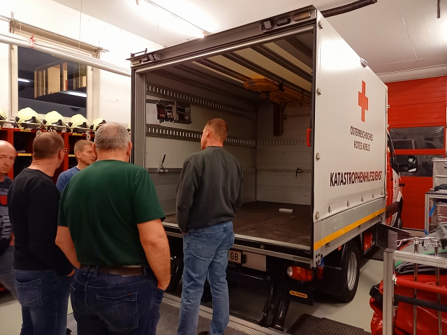 Neben einem theoretischen Teil im Schulungsraum, konnten die interessierten Feuerwehrmänner und -frauen in der Fahrzeughalle ein Katastrophenschutzs-Sonderfahrzeug der Rettungsabteilung Feldkirch mit speziellem Equipment begutachten und erhielten einen ausführlichen Einblick in dieses Spezialeinsatzgebiet der Männer und Frauen in Rot.
