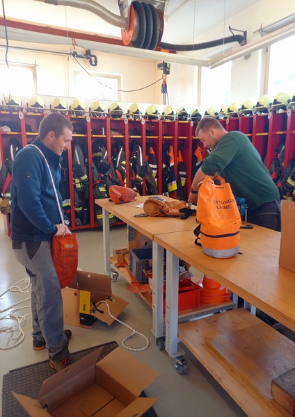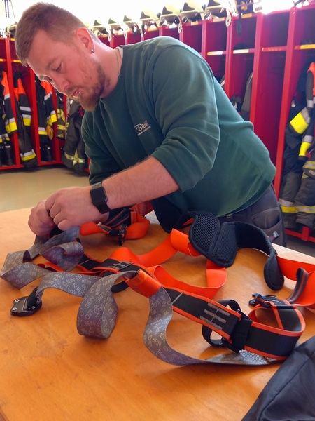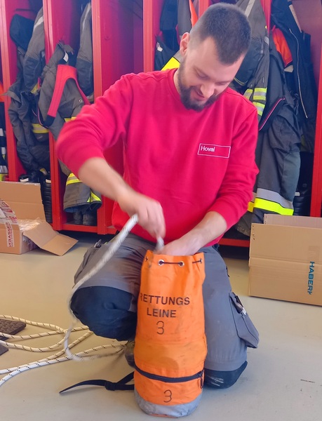 Aus diesem Grund wurden am vergangenen Samstag, 18.03.2023, alle Rettungsgeräte der jährlich vorgeschriebenen Prüfung unterzogen. Darunter fallen sämtliche Seile und Leinen, alle Materialien zur Personenrettung bzw. -sicherung sowie alle Gerätschaften zur Absturzsicherung.