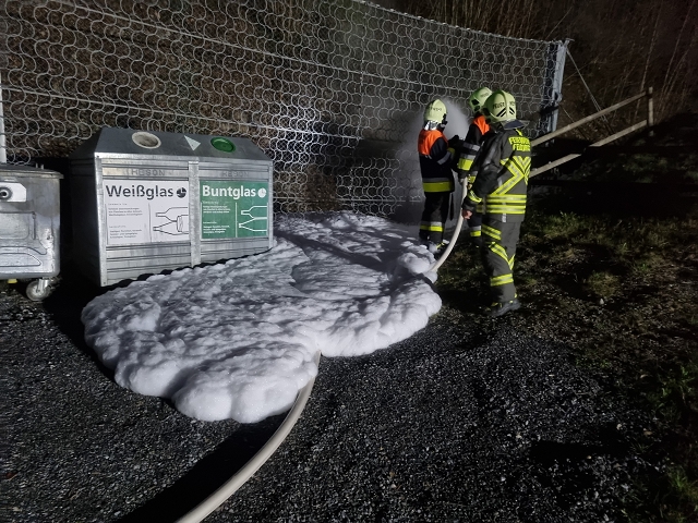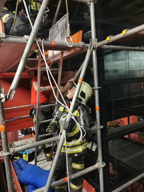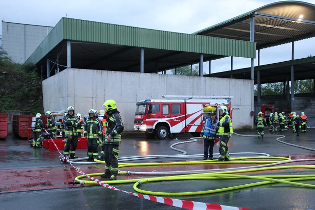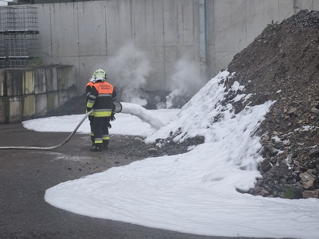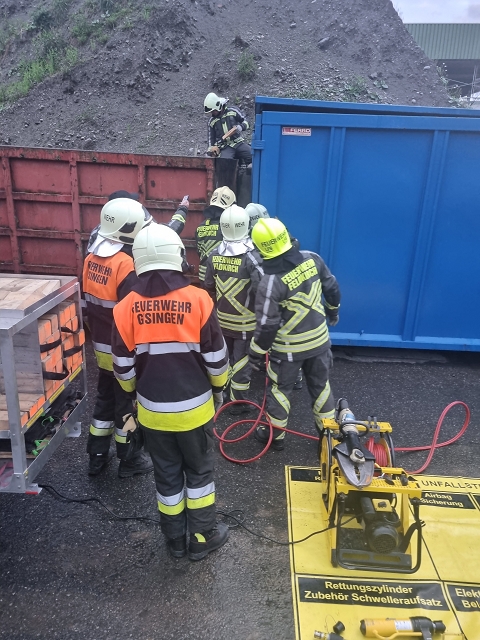 Weil beide Feuerwehren jeweils mit dem gesamten Löschzug anrückten, wurden zwei weitere Übungsszenarien auf dem Firmengelände nachgestellt. Ein Arbeiter hatte beim Verschieben eines Containers den Chemieunfall bemerkt und ließ sich dadurch ablenken. Er übersah in weiterer Folge einen Arbeitskollegen, welcher bei Schweißarbeiten zwischen den Containern eingeklemmt wurde und nur mit schwerem Gerät befreit werden konnte. Der Schweißbrenner entzündete im Nahbereich gelagerte Altstoffe, was einen Flüssigkeitsbrand zur Folge hatte. Der Eingeklemmte konnte unter dem Einsatz von hydraulischen Rettungsgerät - Stützpunktaufgabe der Feuerwehr Gisingen - geborgen und an die Rettungskräfte übergeben werden. Der Flüssigkeitsbrand konnte mittels Schaumangriff abgelöscht und eine weitere Brandausbreitung verhindert werden.