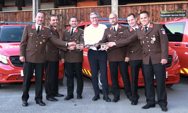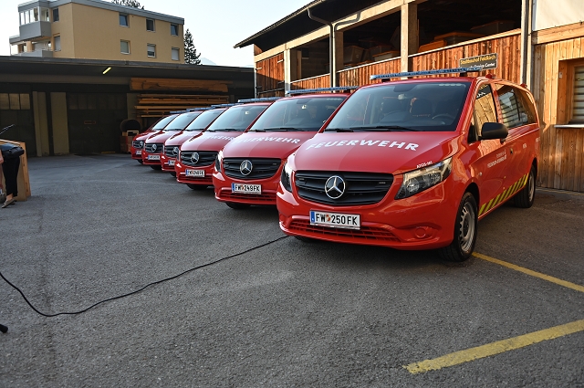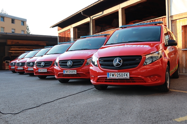 Mit diesen Gruß- und Dankesworten eröffneten AFK Fröhlich und BFI Huber am 11.09.2023 die feierliche Fahrzeugsegnung und Fahrzeugübergabe an die 6 Ortsfeuerwehren von Feldkirch. Alle Fahrzeug des Fahrgestellherstellers Mercedes Benz, Typ: Vito Tourer PRO 116 CDI wurden einheitlich durch die Firma ATOS zu Einsatzfahrzeugen aufgebaut und angepasst. Sie verfügen über ein Automatikgetriebe, 9 Sitzplätze (inkl. Fahrer) und sind als reine MTF (Mannschaftstransportfahrzeuge) ausgestattet. Sie transportieren - neben Mannschaft - u.a. eine Funkfixstation und Handfunkgeräte, Feuerlöscher, Ersthelferrucksack, Verkehrsdienst- und Absperrmaterial sowieTaschenlampen.