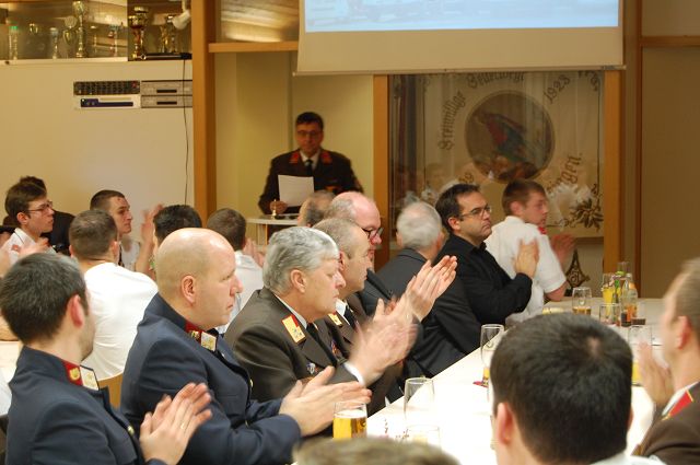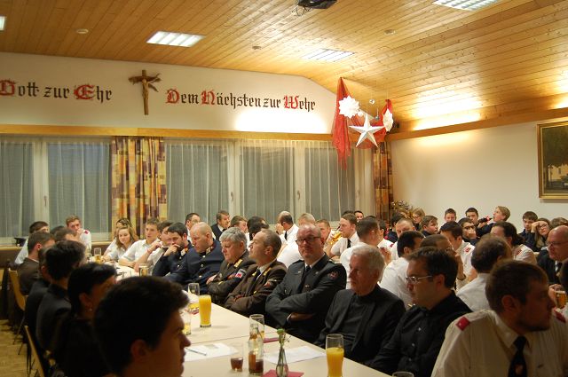 So nahmen als Vertreter der Pfarre Gisingen Pfarrer Dr. Thomas Felder und Kaplan Mag. Josef Gruber teil. Auch Bgm. Mag. Wilfried Berchtold, OV Peter Stieger und Christine Burtscher (Abteilung Einkauf der Stadt Feldkirch) wohnten der Versammlung bei. Ebenso konnte Kdt. Tschann BFI Manfred Morscher (Landesfeuerwehrverband Vorarlberg), AFK Hubert Bonner, den Dienststellenleiter des Roten Kreuz Paul Kräutler, Bez.Insp. Samuel Stadelmann (Polizeiinspektion Feldkirch), Bez.Insp. Arno Vögel (Städtische Sicherheitswache Feldkirch), sowie als Vertreter unserer Nachbarwehr Altenstadt, Kdt. Markus Berchtold und Kdt.-Stv. Frick Marcel begrüßen. Auch unsere Fahnenpatin Gertrud Allgäuer ließ es sich nicht nehmen, die Einladung der Feuerwehr Gisingen anzunehmen.